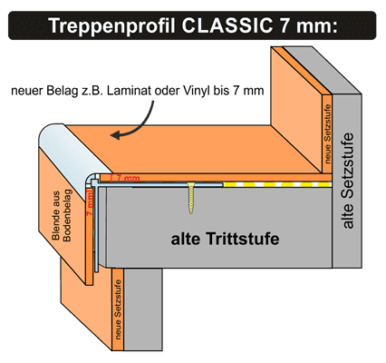Unser CLASSIC 7 mm Treppenprofil ist auf allen neu zu verkleidenden und auf leicht abgenutzten Innentreppen einsetzbar. Bei stark ausgetretenen Treppen sollten Sie unser STANDARD oder STABIL Treppenprofil verwenden.