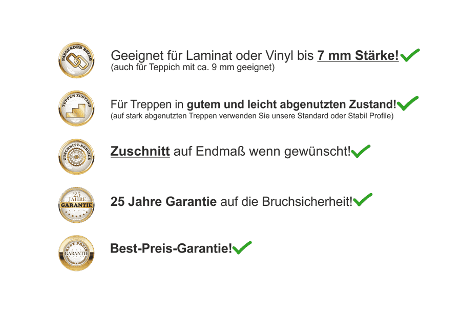 Für Laminat oder Vinyl bis 7 mm oder Teppich bis 9 mmFür Treppen in gutem und leicht abgenutzten Zustand